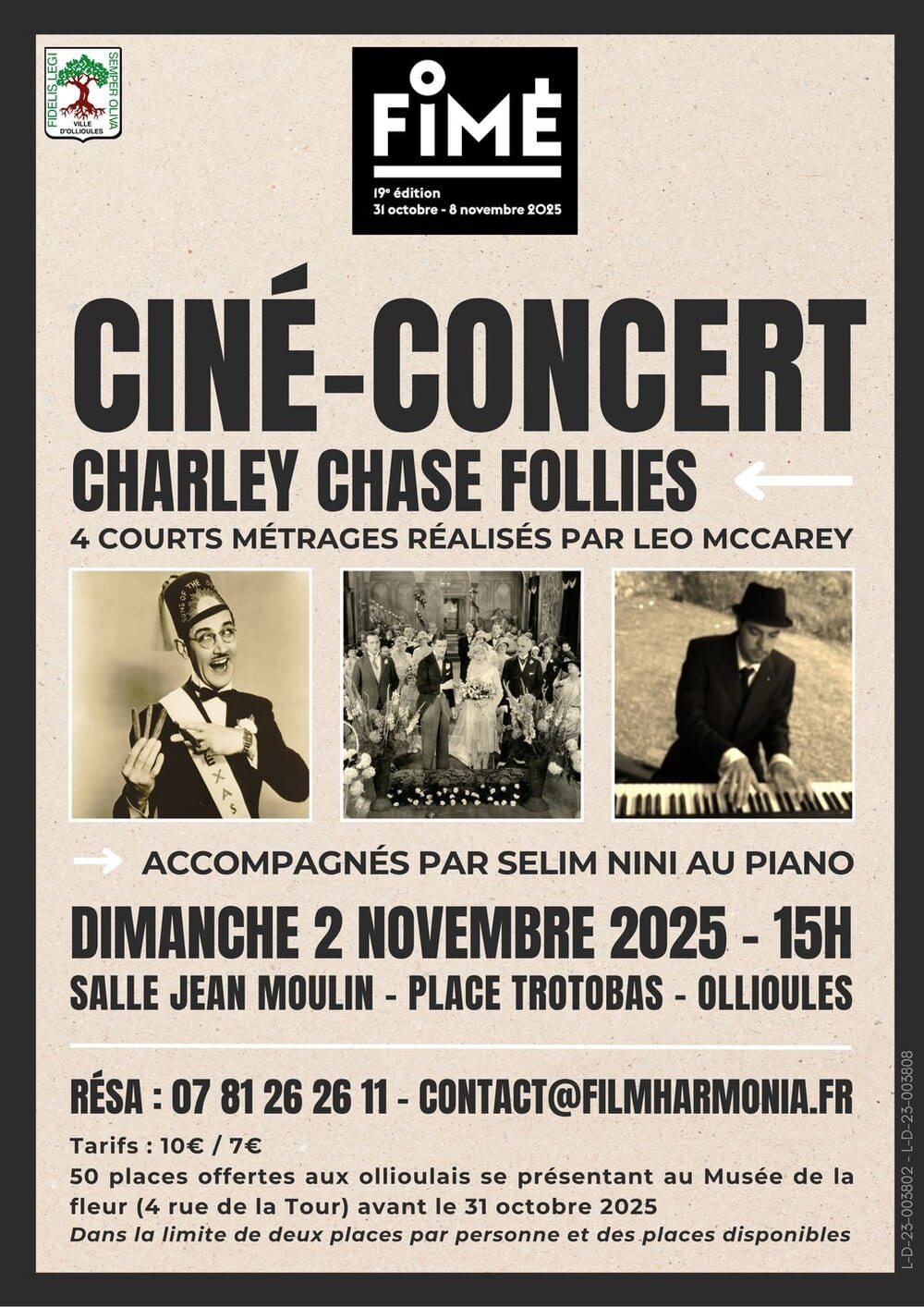 IL RESTE DES PLACES !! Comme chaque année la ville d’Ollioules offre à 50 administrés la possibilité d’assister gratuitement au ciné-concert : dans la limite de deux places par personne, rendez-vous au Musée de la fleur muni d’un justificatif d’adresse à Ollioules, avant le 31 octobre. (Musée ouvert du mercredi au samedi : 9h-12h/14h-18h).