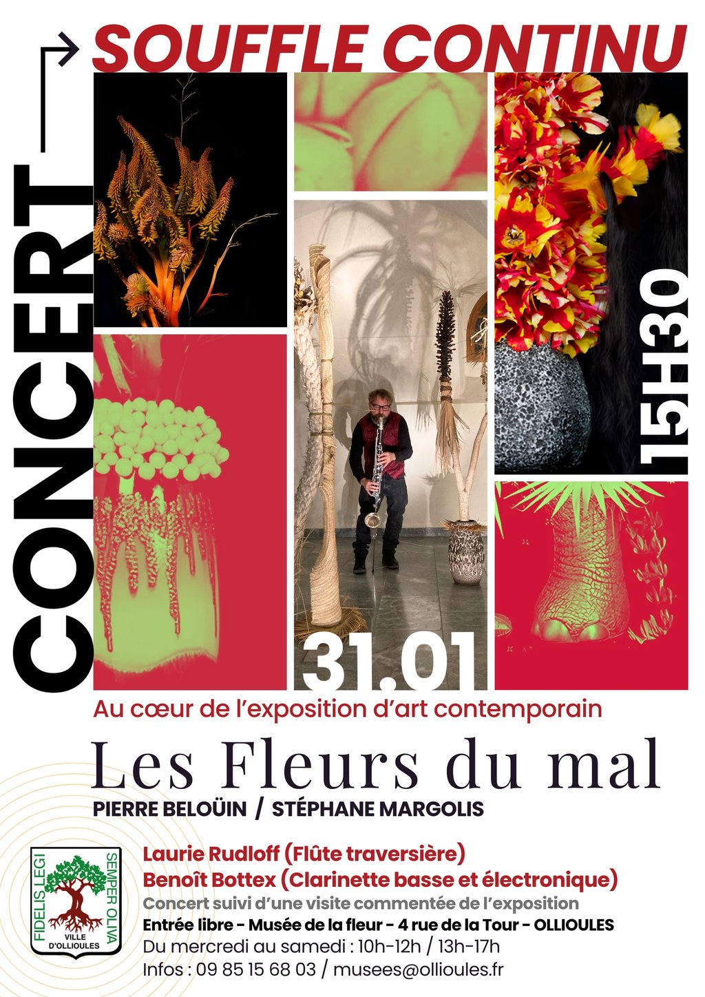 Une occasion unique de découvrir une dernière fois l’exposition temporaire « Les Fleurs du mal » au Musée de la fleur d’Ollioules et de l’olivier !Un concert surprise vous est proposé le samedi 31 janvier à 15h30 pour le dernier jour d’exposition de Pierre Beloüin et Stéphane Margolis. Intitulée Souffle continu, la prestation musicale réunira Laurie Rudloff à la flûte traversière et Benoit Bottex à la clarinette basse et électronique.