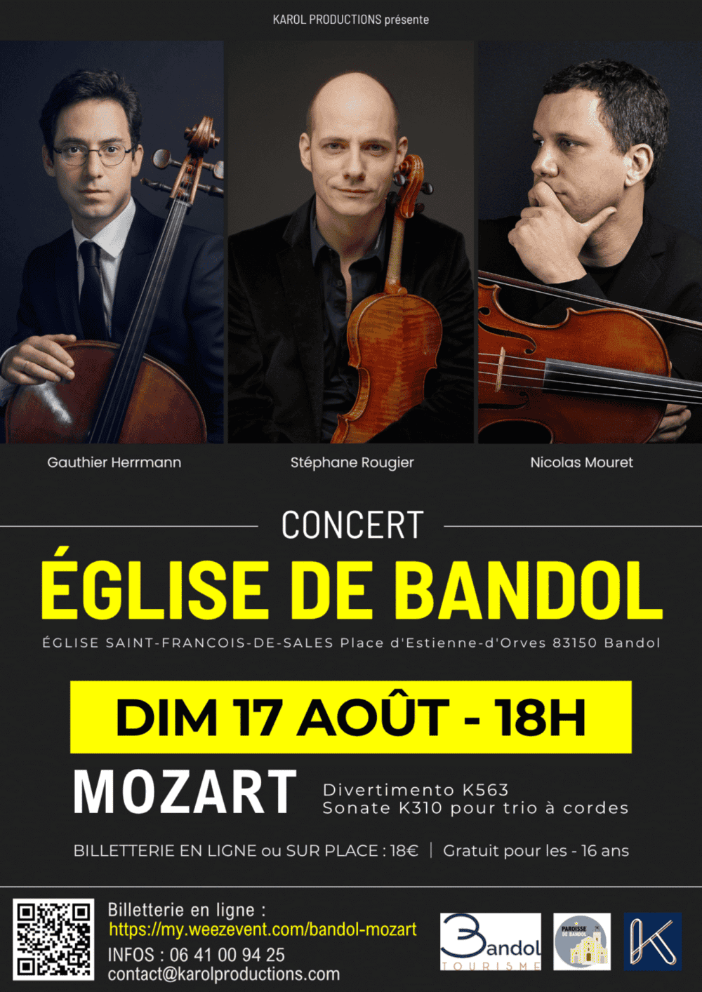 Musique de chambre d’exception avec un trio à cordes formé de trois musiciens de talent autour de l’œuvre de Wolfgang Amadeus Mozart.Dans le cadre enchanteur et intime de l’église de Bandol, ce concert est une invitation à redécouvrir Mozart sous un angle intime, vibrant et profondément humain.