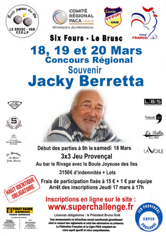 Tarifs : 15 € + 1 € par équipe. Arrêt des inscriptions jeudi 17 mars à 17h. Organisateur : Boule Joyeuse des Îles Lieu : Terrain de boules du Brusc, jardin Georges Martin.