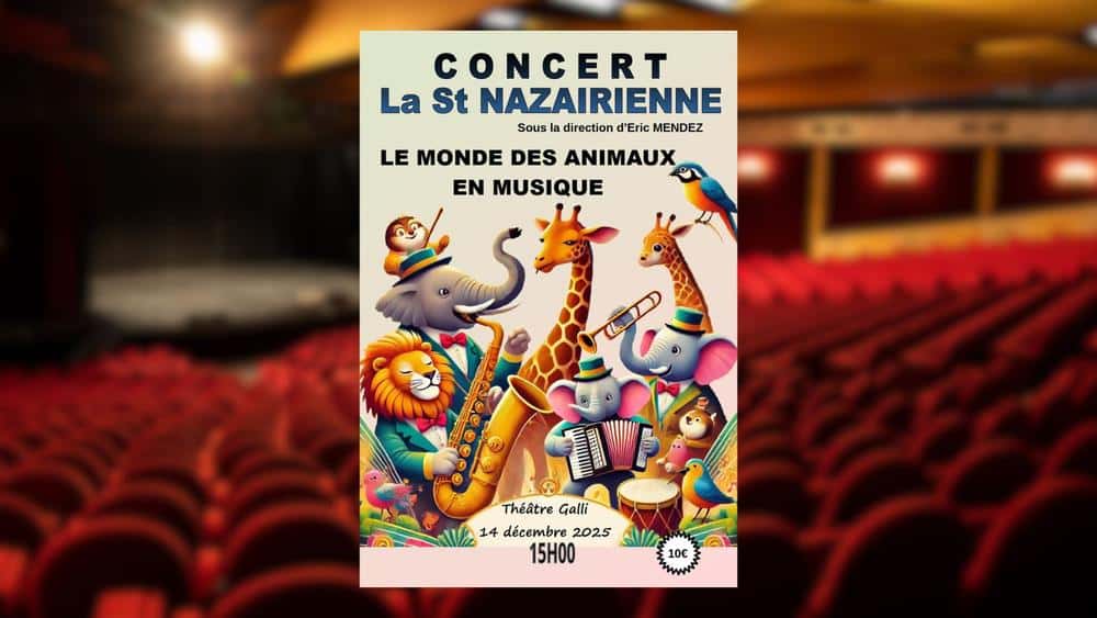 Pour son concert de fin d’année, la Société Musicale La Saint Nazairienne se propose de vous faire passer un agréable moment en vous plongeant dans le monde des animaux mis en musique.Bien sûr, le célèbre « Carnaval des Animaux » de Camille Saint Saëns sera mis à l’honneur, une création de Bert Appermont pour évoquer le déluge de l’Arche de Noë ainsi que la bande originale du long métrage « Les Aristochats » de Walt Disney ; la vie sauvage des animaux de la savane africaine sera évoquée ainsi que les animaux du cirque.Les musiciennes et musiciens de la Saint Nazairienne vous réservent quelques belles autres surprises sur le monde animal et toujours en musique.