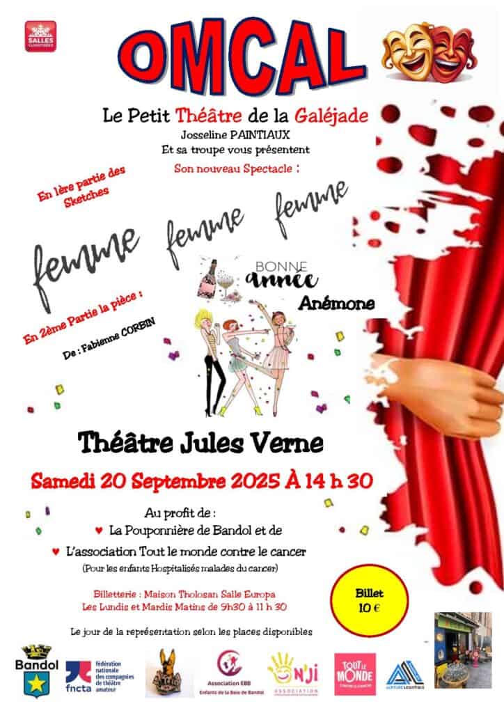 Organisé par l’association OMCAL. Au profit des enfants des Lauriers roses et pour l’association « Tout le monde contre le cancer ». Date : 20 Septembre à 14h30. Tarif 10 euros. Renseignements : 06 32 69 29 96. Lieu : Théâtre Jules Verne.