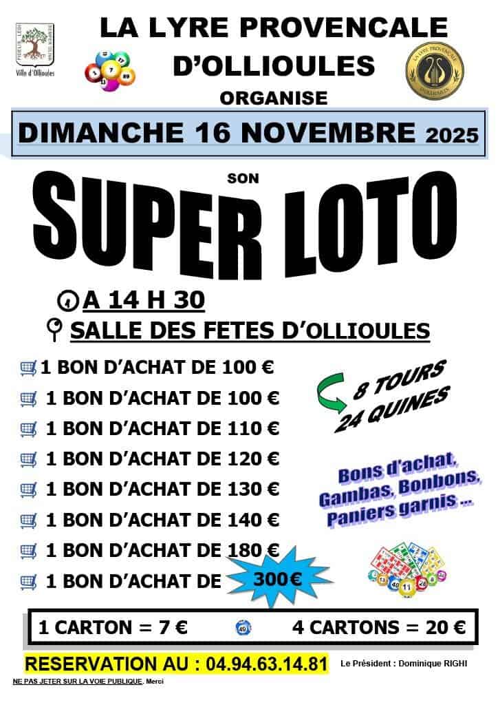 De lots sont à gagner pendant 8 tours et 24 quines avec un super gros lot de 300€ en bons d’achats.Date : Dimanche 16 novembre de 14h30 à 18h00.