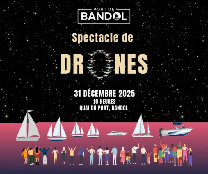Pour lancer la soirée du réveillon, le Port de Bandol vous offre à nouveau un moment magique… encore plus spectaculaire que l’an dernier !300 drones illumineront le ciel pour un show inédit, mêlant poésie, surprises et clins d’œil à notre belle ville.