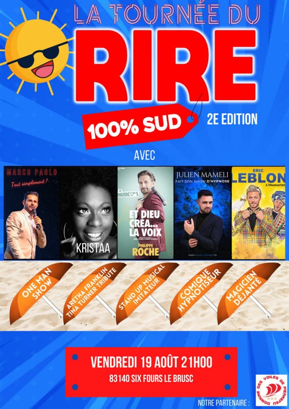 Plateau d’artistes professionnels ou tous les styles d’humour sont représentés : One-man-show, stand up, humoriste mentaliste, comique hypnotiseur imitateur, burlesque.. Date : Vendredi 9 septembre 2022 à 21h. Gratuit. Renseignements : Comité de Liaison des Associations Bruscaines 06 11 10 94 83. Lieu : Port du Brusc.