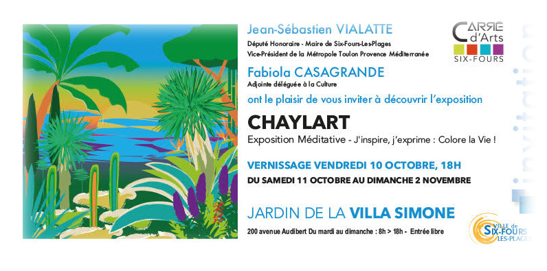 Dates Expo : 11 Octobre au 2 Novembre. Entrée libre. Renseignements : 04 94 10 49 90. Lieu : Villa Simone.
