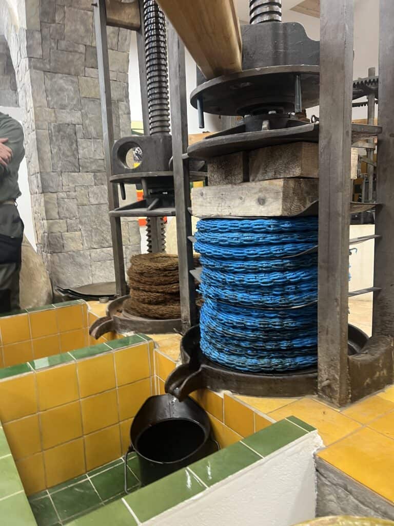Démonstration de broyage et pressurage dans le moulin traditionnel