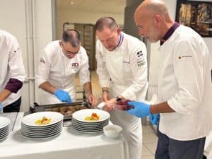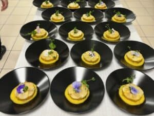 Pour que l’équipe de restauration de l’EHPAD soit fin prête le jour J, François Adamski a d’abord reçu le chef de brigade, Laurent, lors d’une journée de formation. “C’était une super expérience”, confie ce dernier, “c’est toujours agréable de se perfectionner”, d’autant que, “quel que soit son niveau, c’est un métier où l’on apprend tous les jours”, ajoute François Adamski. Après les cuisines de Matignon et celles d’autres établissements prestigieux (le Ritz, le Plaza Athénée, la Maison Prunier ou l’Intercontinental), c’est désormais pour une soixantaine de compagnies aériennes que le MeilleurOuvrier de France 2007 crée des plats signatures, au sein du groupe Servair. “Je prends sur mon temps personnel pour venir ici et assurer ce type de prestations. C’est un plaisir d’être ici car il y a énormément d’émotions à la fin du service. Les résidents, qui ne vont plus au restaurant, sont heureux que le restaurant vienne à eux. La cuisine c’est avant tout du partage, du plaisir et de l’amour”. Pour que la fête soit totale, le personnel soignant avait troqué sa blouse pour le costume de serveur de palace. Noeud papillon, chemise blanche, pantalon noir : la classe intégrale pour servir les plats dressés minute à même la salle.
